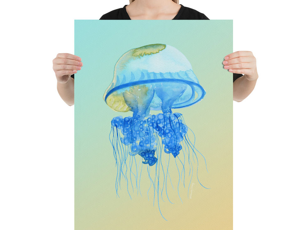 The Cauliflower Jellyfish - Iridescent Print highlights the natural glow of this unique jellyfish with shimmering tones. Perfect for bringing a luminous, oceanic touch to your walls.