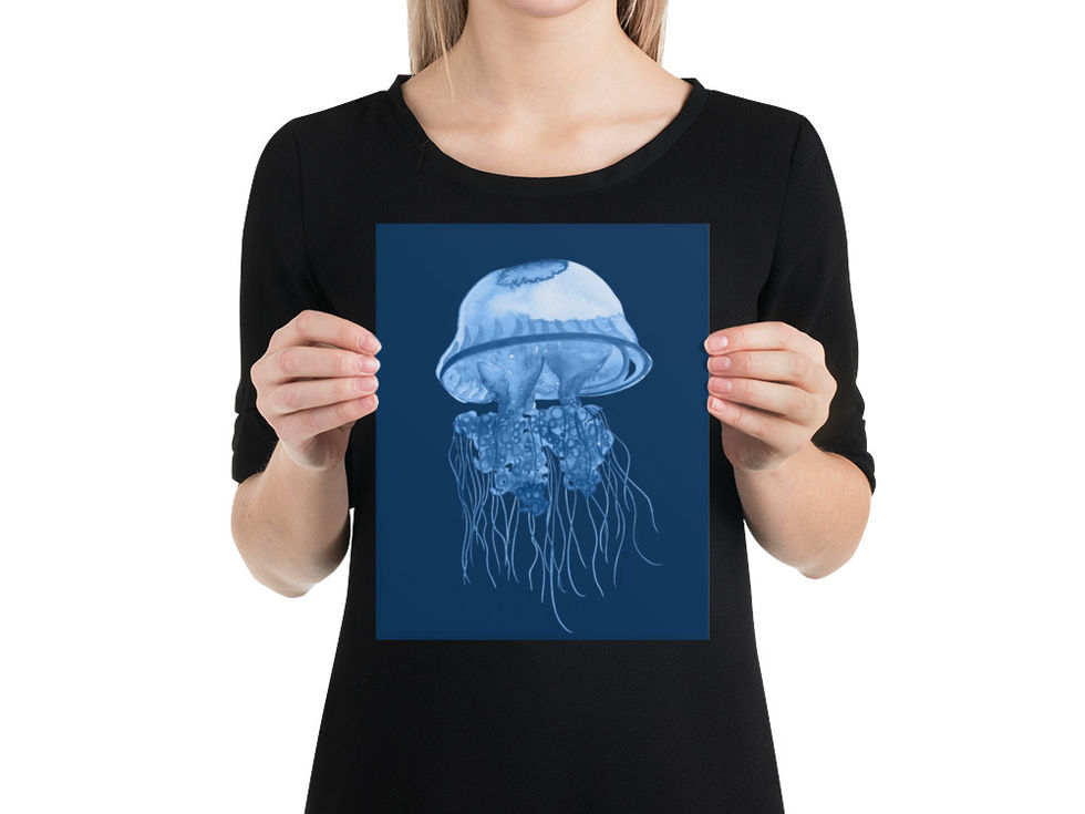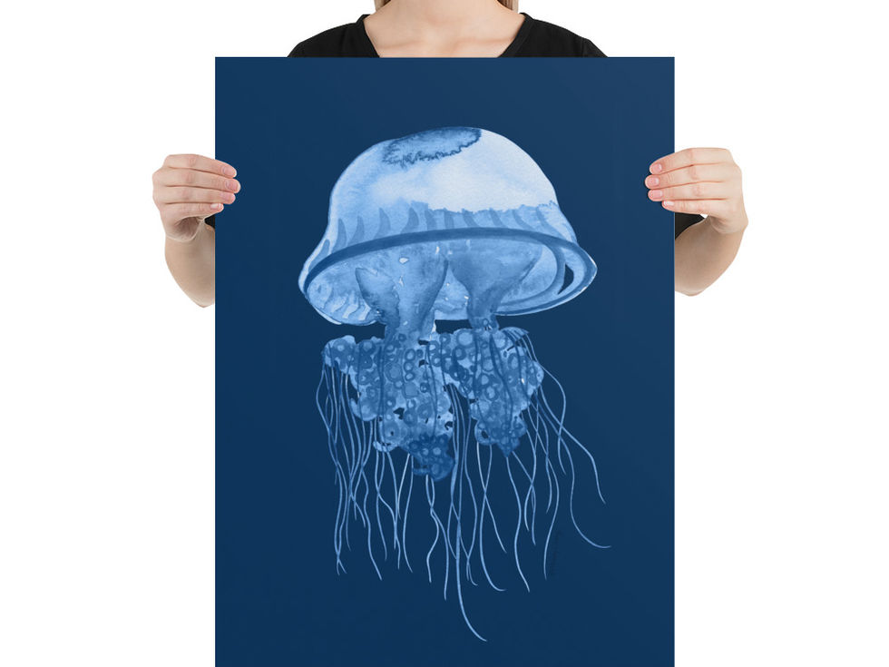 The Cauliflower Jellyfish - Sapphire Blue Print showcases this elegant sea creature in deep sapphire tones. Its rich color adds depth and sophistication, making it a striking centerpiece for ocean-inspired decor.