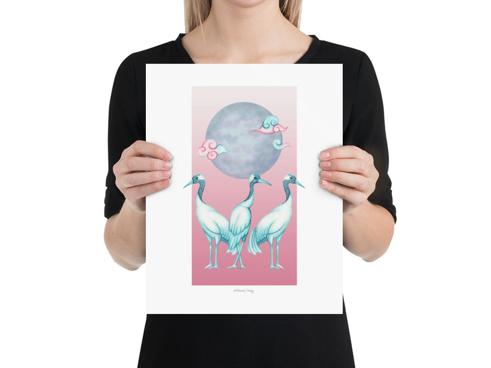 The Celestial Cranes Trio Print depicts three graceful cranes standing together beneath a luminous moon and drifting clouds. With its soft pastel tones and balanced composition, this artwork symbolizes unity, tranquility, and harmony with nature. A refined piece of wall art perfect for bringing calm and elegance into your home.