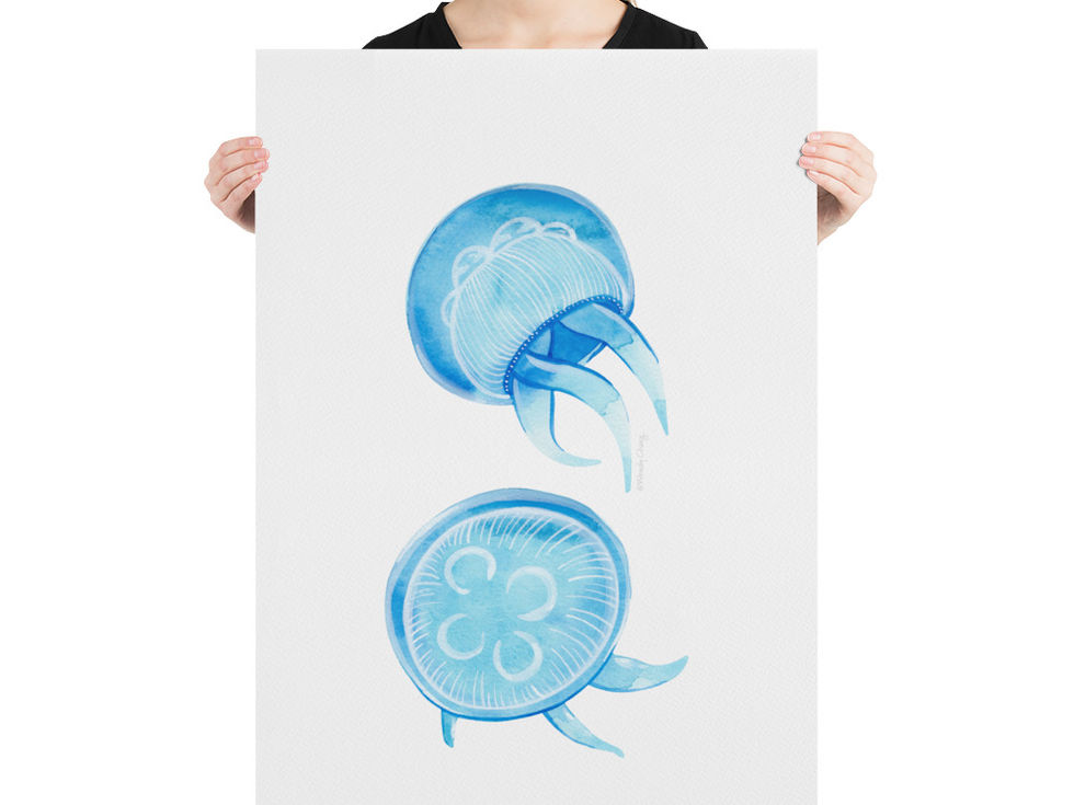 The Crystal Jellyfish - Blue Print captures the delicate transparency of this species in calming blue tones. A serene piece, perfect for creating a peaceful atmosphere in your home.