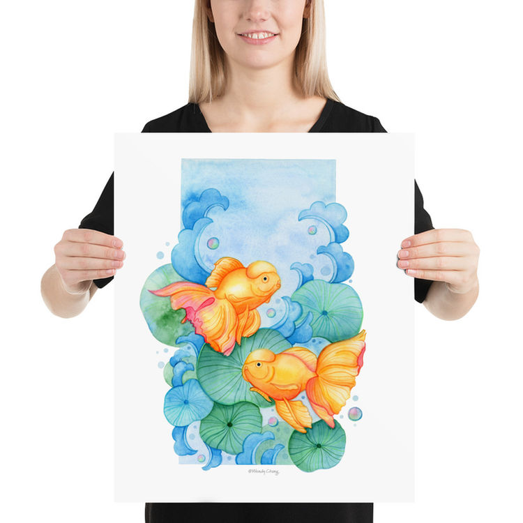 The Dancing Waters Duo Goldfish Print features a vibrant pair of goldfish swimming gracefully among rippling waves and lily pads. With its bright colors and flowing movement, this artwork brings joy, harmony, and a refreshing touch of nature to any space.