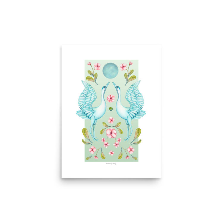 The Floral Harmony Cranes Print features a graceful pair of cranes surrounded by blossoms and leaves beneath a glowing moon. With its soft colors and symmetrical design, this artwork represents balance, beauty, and connection with nature. A peaceful and elegant addition to any wall.
