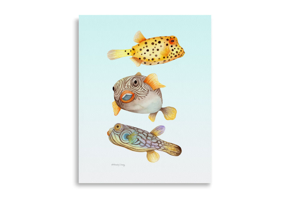 The Puffer Fish - Duotone Gradient Print features a playful set of three puffer fish illustrated in a bold duotone gradient. This modern design adds a lively and artistic touch to any space.
