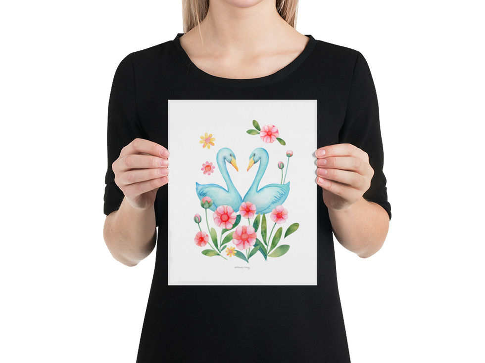 A graceful pair of swans nestled among blooming florals, painted in delicate watercolor detail. This artwork celebrates love through nature, balance, and quiet elegance.